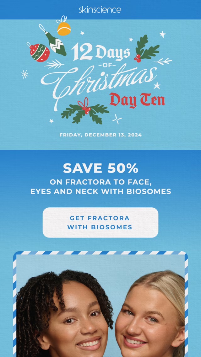 SkinScience brought us in for their biggest revenue generator of the year. We handled copywriting, design, and deployment for the annual 12 Days of Christmas campaign.